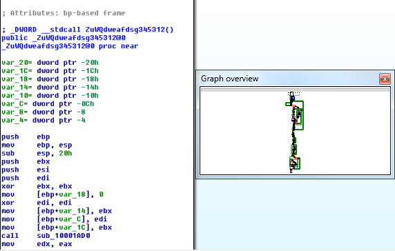 The first 1445 bytes of the allocated area represent the unpacking stub. The stub is used to decrypt a DLL file residing just after it. Upon the end of the decryption process, a jump is made to an exported function of the DLL called: _ZuWQdweafdsg345312.