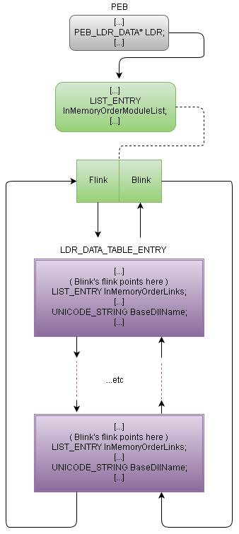 - For each BaseDllName in the doubly linked list calculate a hash, compare it to hashes of interest (ntdll.dll hash).