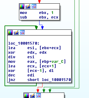 Following the execution from DllMain, we soon find ourselves in the first routine of interest sub_1000D7E0. It starts off by calling sub_100014F0 that I renamed to Decrypt_xxxx. This routine takes an output pointer to a structure as a parameter first locates the virtual address .xxxx section's header address. Then from it, finds the pointer to the first byte of this encrypted section. The section is decrypted using this simple xoring algorithm: