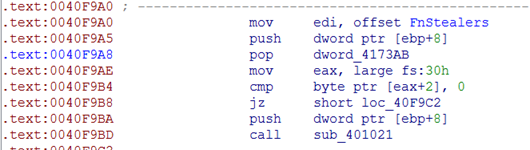Let's now have a look how Pony tries to steal passwords. All the routines responsible for stealing stored credentials are stored in a pointer array:
