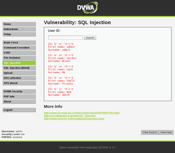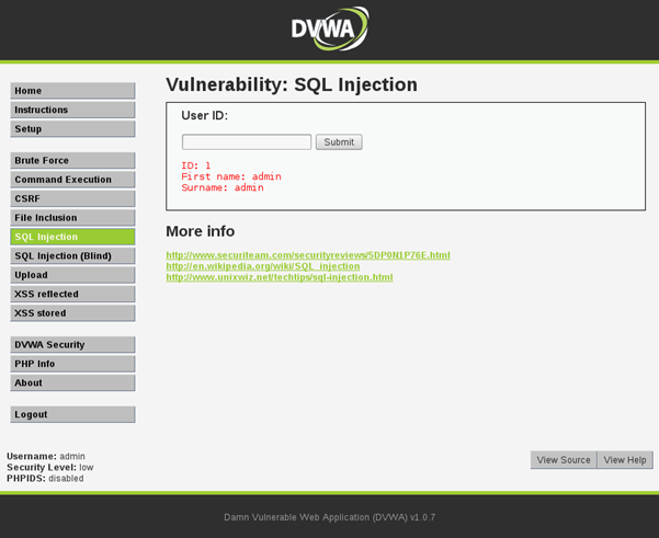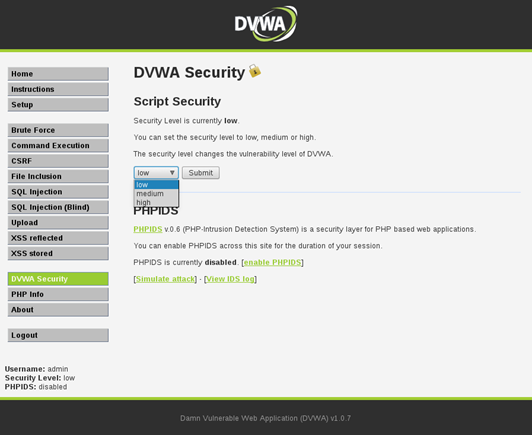 Note: If you follow these steps, make sure you set the security level to "Low" via the "DVWA Security" link on the left side.