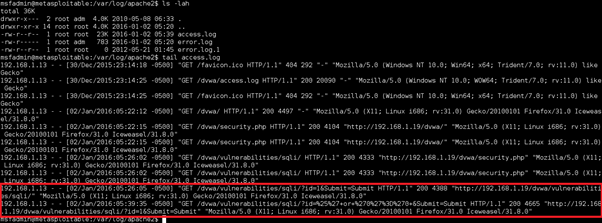 When we 'tail' the varlogapache2access.log file on the Metasploitable host, we can see that the normal and the attack query are recorded.