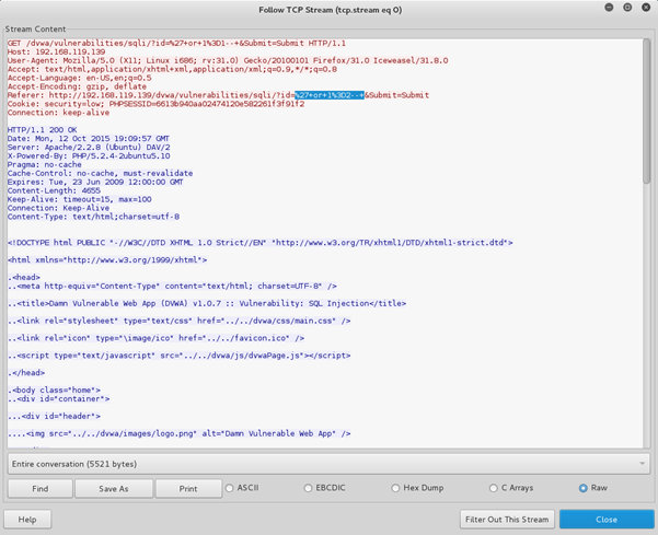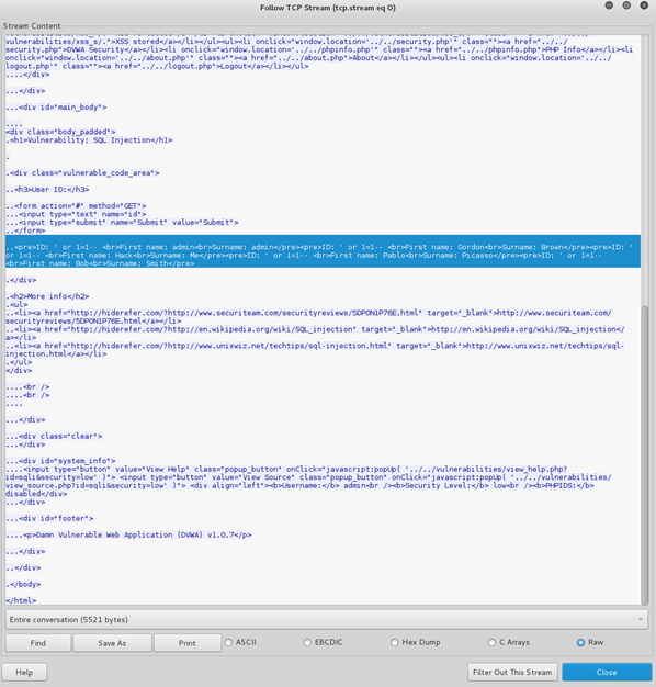 This time, we can see the returned server traffic and the results of the query. This will enable the analyst to determine the outcome and impact of the attack on the target server.