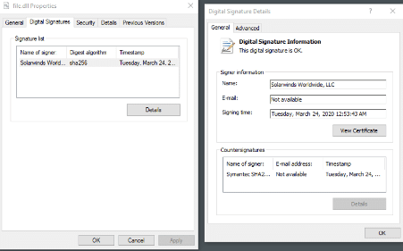 Figure 5: Malicious DLL digitally signed by SolarWinds Worldwide, LLC.