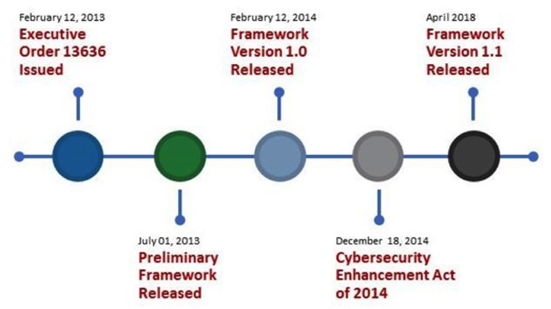 Since the framework’s initial development and creation, it has undergone many changes, updates and revisions under the open public review and comment processes. The NIST CSF has been developed and revised in line with the original goals of creating a framework that would promote U.S innovation and industrial competitiveness, and it has been watched intently by industry players that continue to participate in the framework’s creation. The below graphic shows key milestones and highlights the way in which the development and creation of this framework has progressed up until present day.