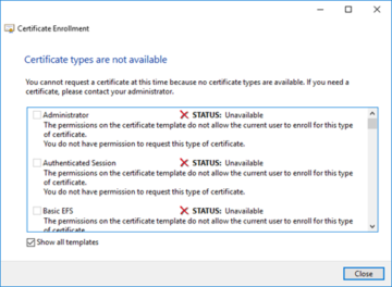Beyond this point, you will see various enrollment methods that have been already configured for your environment through the use of Certificate Templates, or you can click on 'Add New' to manually go through an enrollment procedure as instructed by your Registrar. If we continue on through AD enrollment and it has not been configured yet, we will either see a blank screen or if we click on 'Show all templates', we will see the screen below.