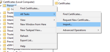 Whatever the means we use, if we need to install the certificate file ourselves, we will want to once again right-click on 'Personal', select 'All Tasks', then click on 'Import'.