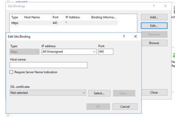 In order to use a certificate for the site, we'll need to make sure that we are using HTTPS, and traditionally port 443. At the bottom of this screen, we will then see a dropdown menu to select our SSL Certificate. Once chosen, we can click on 'OK' and 'Close' to leave this area.
