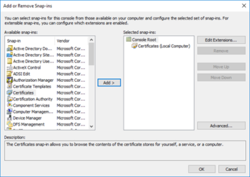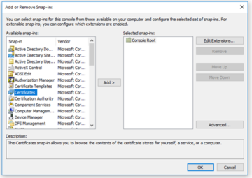 Depending on how your system is configured, you may have access to an enormous number of possible snap-ins, but the one we are going to be looking at right now is just the 'Certificates' snap-in.