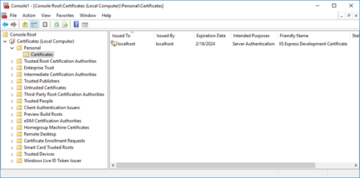 Once we are in the Certificates (Local Computer) snap-in, we will see a tree view of many different categories of Certificates. In this case, because we are dealing with identification for the server, we'll want to drill down into the 'Personal' category, followed by 'Certificates'.