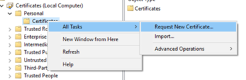 If we need to create a CSR in Active Directory, we'll want to right-click on either 'Personal' or the 'Certificates' immediately below that, select 'All Tasks', and finally click on 'Request New Certificate…'.