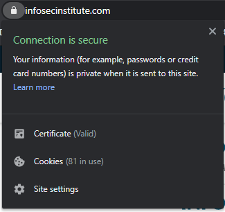 If we take a look at a website such as https://www.infosecinstitute.com, in most modern browsers we will see a 'padlock' icon- signifying that the connection we are using is secured. We can dig into this more by clicking on the padlock and verifying this.