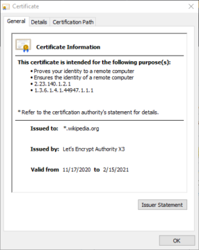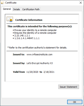 In this instance, the certificate was issued by 'Let's Encrypt'- a Certificate Authority (CA) that exists to promote secure browsing across the web- with an expiration date in 2021. The fact that certificates can expire can be both annoying and critical to security in equal measure. It can be annoying because it means that updated certificates must be re-issued to the appropriate devices, sites and services that use them on a regular basis before they expire. It can be critical however because without this ability to expire or be disallowed, compromised certificates could continue to be used forever. The CA will keep track of certificates that are allowed and blocked, and provide this information on demand to users trying to access this resource.