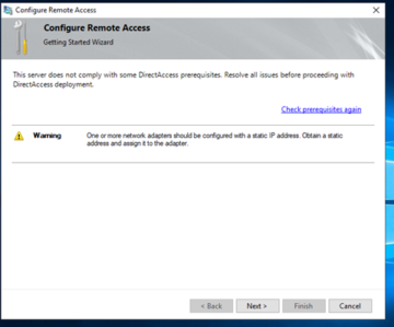 Here is where the settings will start to vary depending on your environment- whether this server is directly connected to the web, acting as an intermediary between a DMZ and the internal network, or is only on the internal network. Once you have set up your connection and address/IP that clients will be using, you will want to click on 'Next'. This step is why we made sure that IPv6 is enabled on our connection earlier; as if you do not have it turned on, you will receive an error message on this phase.
