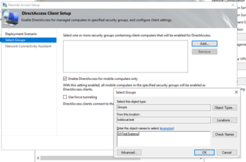 We still want to use DirectAccess for clients, so we can just click on 'Next' on the first screen before going to the 'DirectAccess Client Setup'. We will want to remove 'Domain Computers' from this section, as we do not need to have everything go through this single point. Rather, we can select a particular group of computers from AD, which can be quickly modified through standard methods. Also at least during the testing phase, we will want to remove the checkbox from 'Enable DirectAccess for mobile computers only'. After we select the group, click 'Finish'.