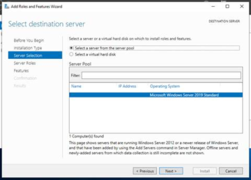 You will need to select the destination servers you are choosing to install the role onto, and for the purposes of our example here, we are located directly on the server in question. Once we choose the server we need, click 'Next'.