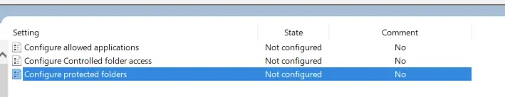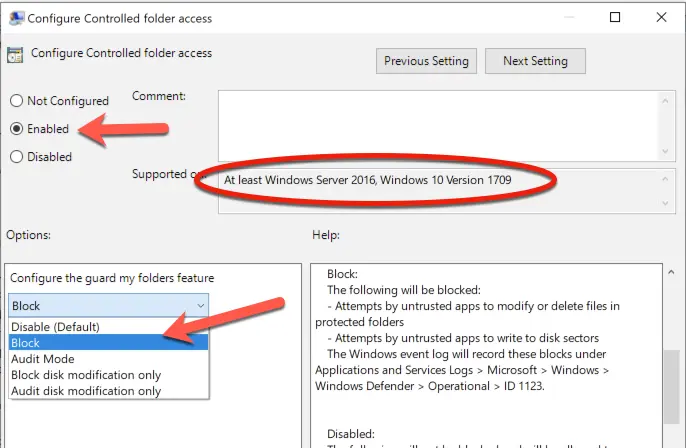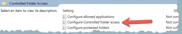 1 Open Group Policy Editor → Administrative Templates → Windows Components → Windows Defender Antivirus → Windows Defender Antivirus → Windows Defender Exploit Guard → Controlled Folder Access