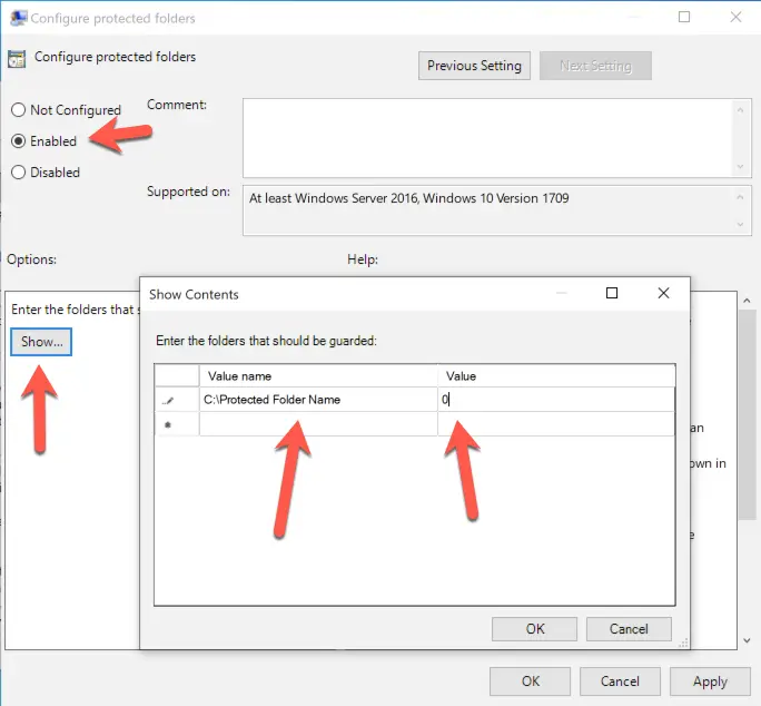 3 If you wish to identify additional folders to protect, go back to the main CFA window and select Configure protected folders. Select the Enable radio button and click on Show. Add the path to each folder you wish to protect. Place a zero in the Value column.