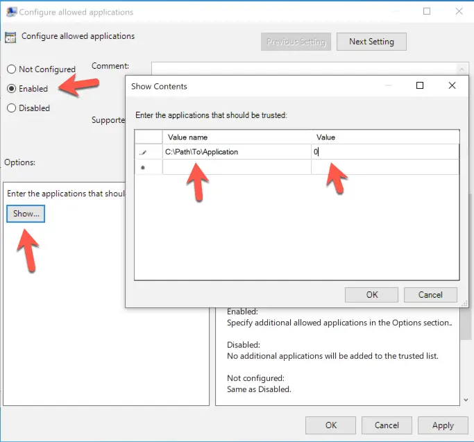 4 Many organizations have internally developed or third-party applications not included on Microsoft’s list of trusted applications. These are identified during the initial auditing period and added to the trusted application list by selecting Configure allowed applications from the CFA group policy window. Select the Enabled radio button and then click on Show. Add the full path for each trusted application and place a zero in the corresponding Value column.