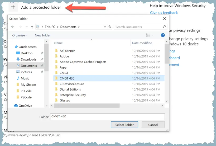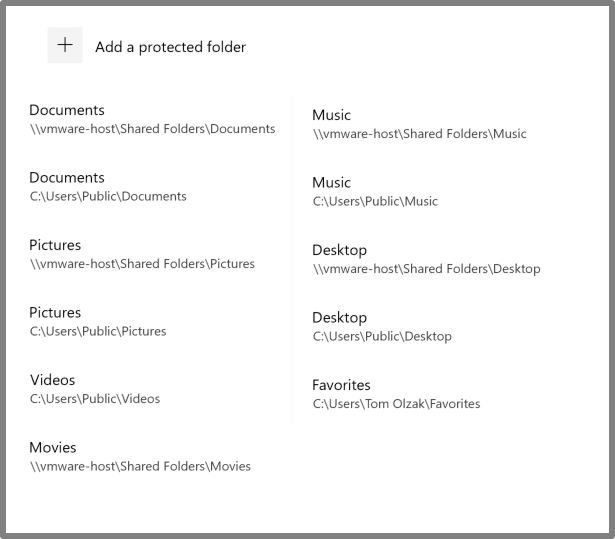 6 This is a helpful list of folders protected by default. I set this up on a Windows 10 virtual machine that shares folders with its host. As you can see, CFA also protects default VM shared folders. If you need to add additional folders for protection, click on the ‘+’ next to Add a protected folder. Select a folder, and CFA immediately begins protection. The folder selected here is already protected under Documents, but you get the idea.