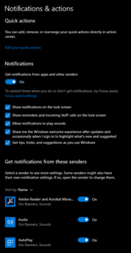 Once we are in this area, we can see exactly what programs are capable of sending notifications, as well as where we are notified and if we want to dial back the messages from Microsoft as well. In the example shown above, we see that Adobe Reader is sending Update notifications pretty regularly right now. However if we have a very specific version of Adobe Reader that we must continue to run at, we may not necessarily need these notifications. Therefore, if we click on the Adobe Reader notification at the bottom, we can either turn it off entirely with the switch, or dial it in for particular settings.