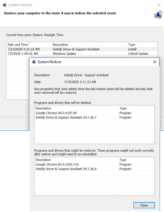 Once in this section, we'll want to select “Open System Restore”. The screen will show us our available system restore points. Once we have chosen the date and time we want to go with, we can click on “Scan for affected programs” to see what choosing this restore point will do. If we are satisfied with this particular restore point, we can click on “Close” and “Next”.