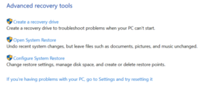 From here you will have your choice of options, including uninstalling updates, using system restore points or using a recovery drive — although the exact options listed and wording of those options can vary considerably. A recovery drive is a complete backup of your system at the time it was taken, and while a restore point should not affect your personal files, a recovery drive will reset the entire system back to that exact time.