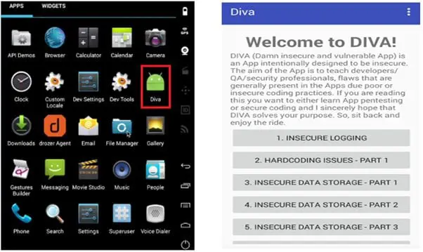 Let's move forward and see how we can conduct recon on an Android application. Here I will use a vulnerable Android application DIVA; this example will provide an understanding of how to leverage the Drozer framework.