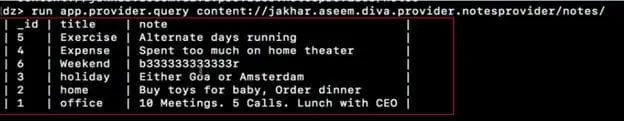 Step1: Let's exploit the exported content providers. As we have seen in the previous screenshot, there was one exported content provider. To get more information on the same, use module app.provider.info as shown in the screenshot.