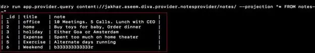 Step5: By issuing the SQL query using app.provider.query module of drozer, we see the SQL tables are exposed, which is evident in the screenshot below.