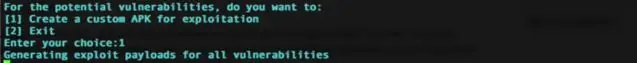 Step4: QARK has done the static analysis on the provided apk, now it's time to create the POCs exploit for the vulnerabilities found in the static analysis. Type 1 to generate the exploit build for the vulnerable apk which have provided.