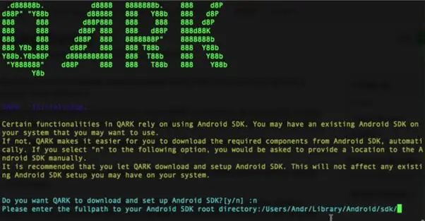 Step5: Navigate to the quark directory to run QARK in the interactive mode, "python qarkMain.py." It asks you to download and install Android sdk if you already have the sdk just locate the path as shown in the screenshot below.