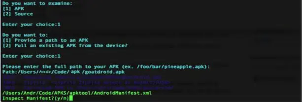 Step1: Choose 1 in the interactive shell and provide the path of the .apk as shown in the screenshot below. Type y to analyze manifest file of Android to find possible vulnerabilities like exported activities, exported services, broadcast receivers, etc.