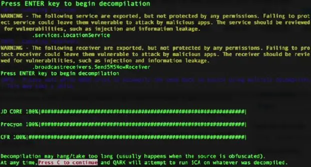 Step2: Press Enter to instruct QARK to initiate decompilation process as a part of the static analysis, QARK uses three different decompilers, JD CORE, Procyon, CFR to decompile an apk. Here it's basically reversing the binaries to potential source code and analyze it further for vulnerabilities.