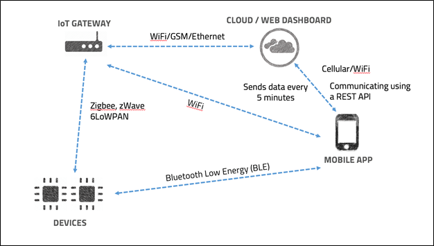 Step 2: Build an architecture diagram for the given device specifying each of the components that is used in various categories we discussed above. If it is a radio communication between two devices, show it with a dotted line and also specify the kind of communication protocol being used. If the application is communicating with the cloud to send and receive data using an API, mark it in the architecture diagram along with the kind of API which is used.
