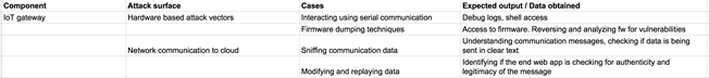 - Hardware based attack vectors – serial communication, firmware dumping, etc. to get access to the firmware and any sensitive information stored in it.