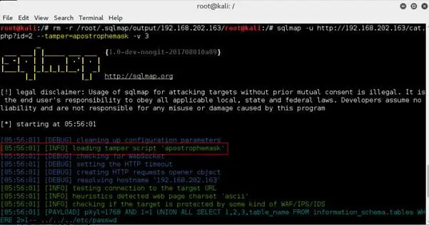 Once the WAF is identified, we can use the tamper script to attack the WAF-protected applications. The tamper script can modify the request to escape WAF detection. The scripts can be found under /usr/share/sqlmap/tamper/ directory.