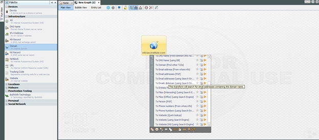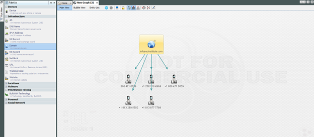 To illustrate how those transforms work, if you choose to transform the entity to phone numbers using search engines, you will get a few phone numbers for InfoSec Institute. You can use these phone numbers to make your social engineering attack more convincing, employ vishing, pretexting and so on.