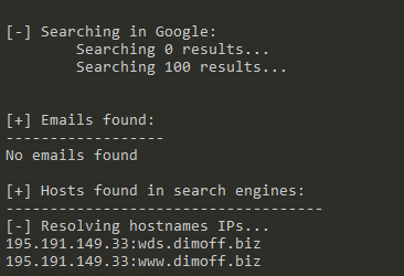 python theHarvester.py -d dimoff.biz -l 100 -b google