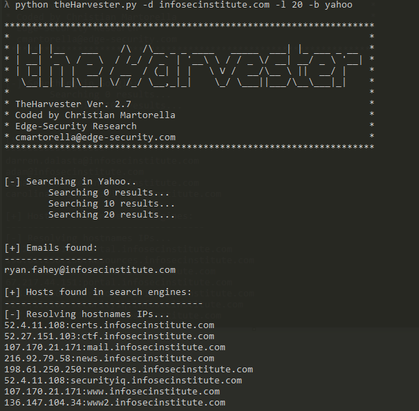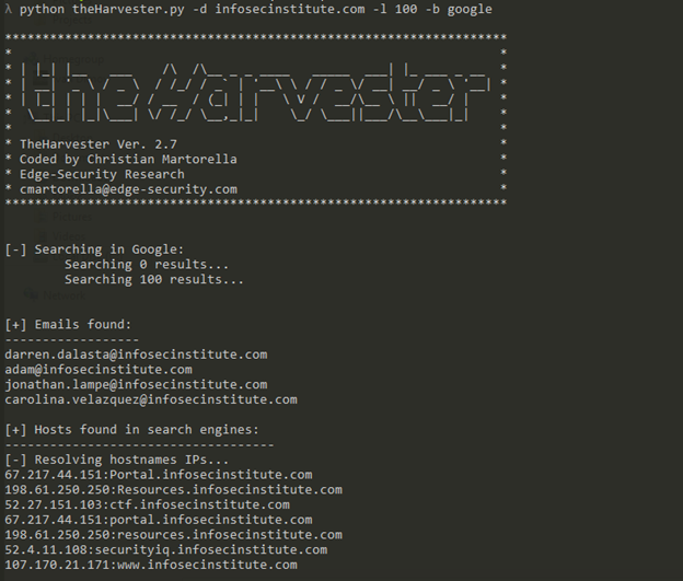 Let us try searching for emails within the InfoSec Institute's website. We type the same query but change the domain: python theHarvester.py -d infosecinstitute.com -l 100 -b google