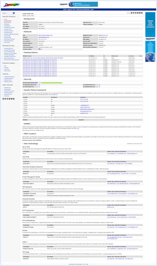 Netcraft is a web application which allows us to see detailed information about the software, the web server and the web host involved with an arbitrary website. Netcraft makes gathering this information painless as it takes milliseconds to get to know the software behind the website. For example, knowing who the web hosting provider of the website is could prove useful if you decide to launch a social engineering attack. Then, you can write an email to an administrator appearing to originate from their web hosting company, asking him/her to open a link and change a setting. Furthermore, the different software development frameworks that the website uses that you can find with Netcraft can have their own vulnerabilities which you can then attempt to exploit. The image below shows a lookup on InfoSec Institute in http://www.netcraft.com/