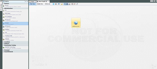 In the palette box to the left, you can see the different entities that you can incorporate into your searches. Drag and drop the Domain entity in the Palette to the graph. You should see a single Earth icon with the site paterva.com as a label.