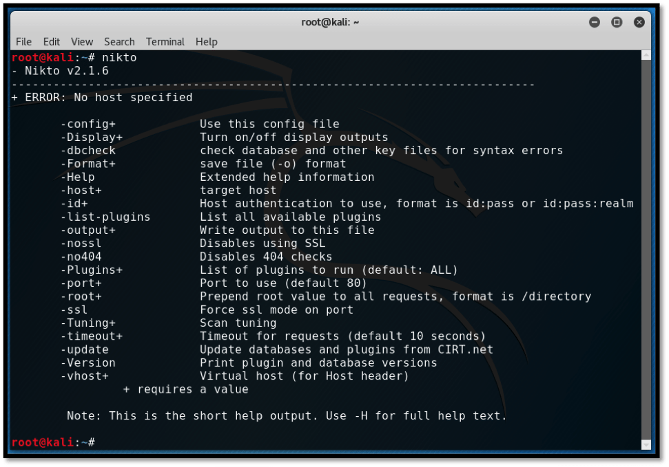 We shall now use Nikto to scan http://webscantest.com which is a website intentionally left vulnerable for testing web application vulnerabilities. Typing on the terminal “nikto” displays basic usage options.
