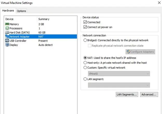 Make sure both Kali (attacker) and command injection OS (victim) network adapters are configured to NAT as shown below.