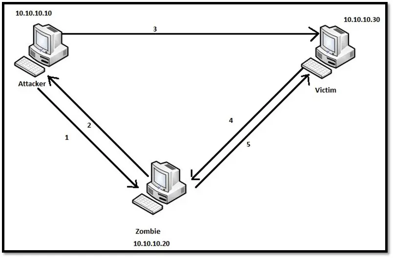 1. The attacker sends the TCP SYN packet to the Zombie, which is up and idle.