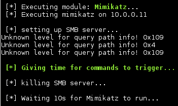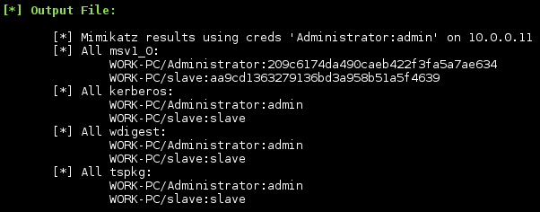 The Mimikatz module dumped the login hashes for two logged-in users, "Administrator" and "slave". One of the biggest advantages of using Mimikatz is that it is executed from memory only, and nothing is written on disk. It can also dump other data like Kerberos tickets if they are stored in memory.