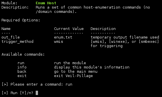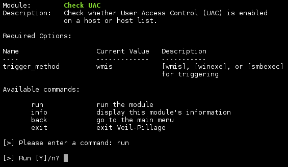 Earlier I had mentioned that some modules have an option "force_method" with values none, powershell & binary. To find out if PowerShell is installed and accessible on the victim machine or not, Veil-Pillage has a module "enumeration/host/detect_powershell".