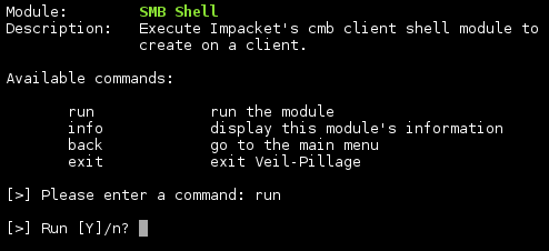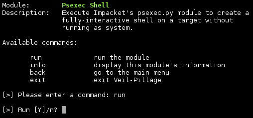 When everything has been setup, go to the "Veil/Veil-Pillage/" directory and run the "Veil-Pillage.py" Python script.