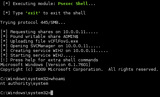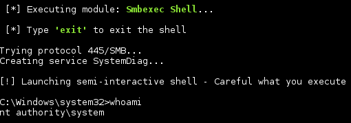 Another shell access module is "impacket/smbexec_shell". This module gives shell access to the victim machine, but is semi-interactive. Being a psexec shell gave a SYSTEM shell access.